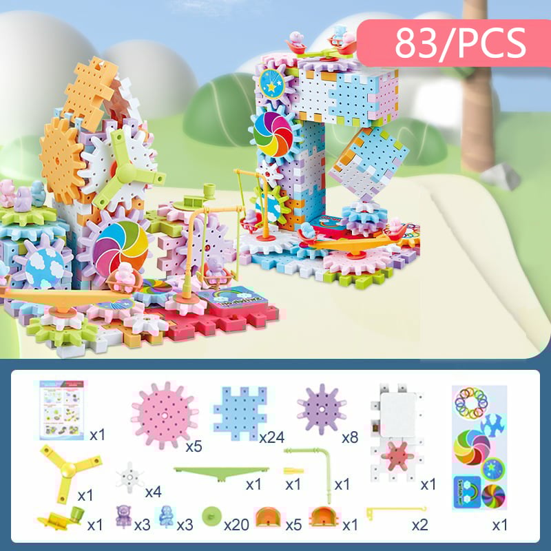 Enhance child hand-eye coordination and design skills by building different shaped gears and blocks!